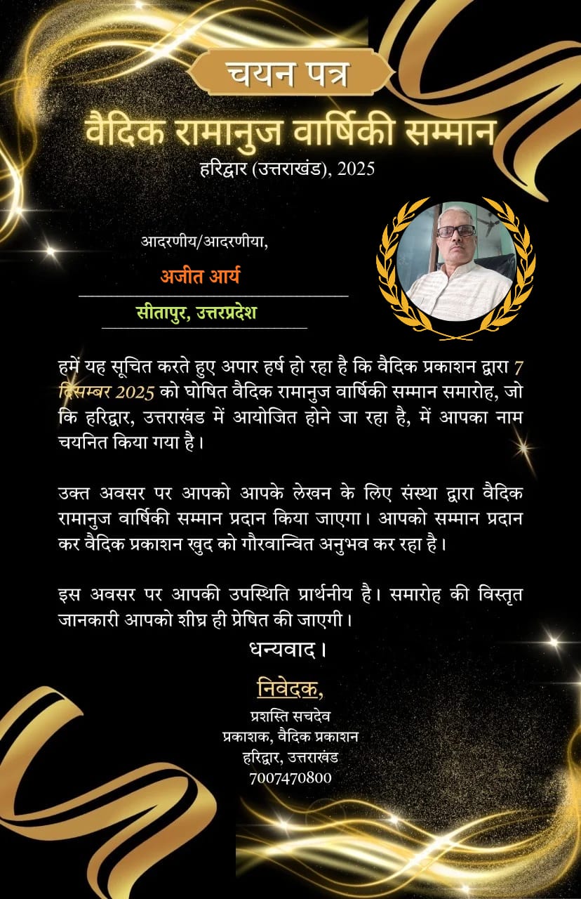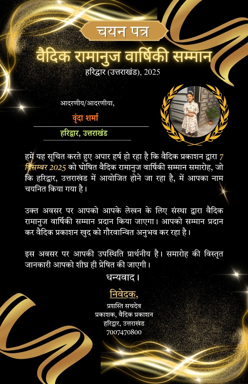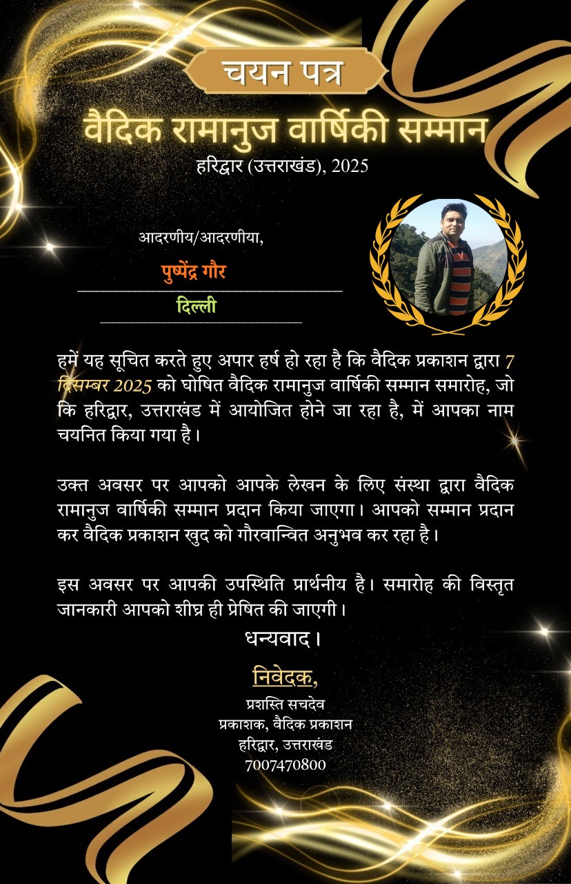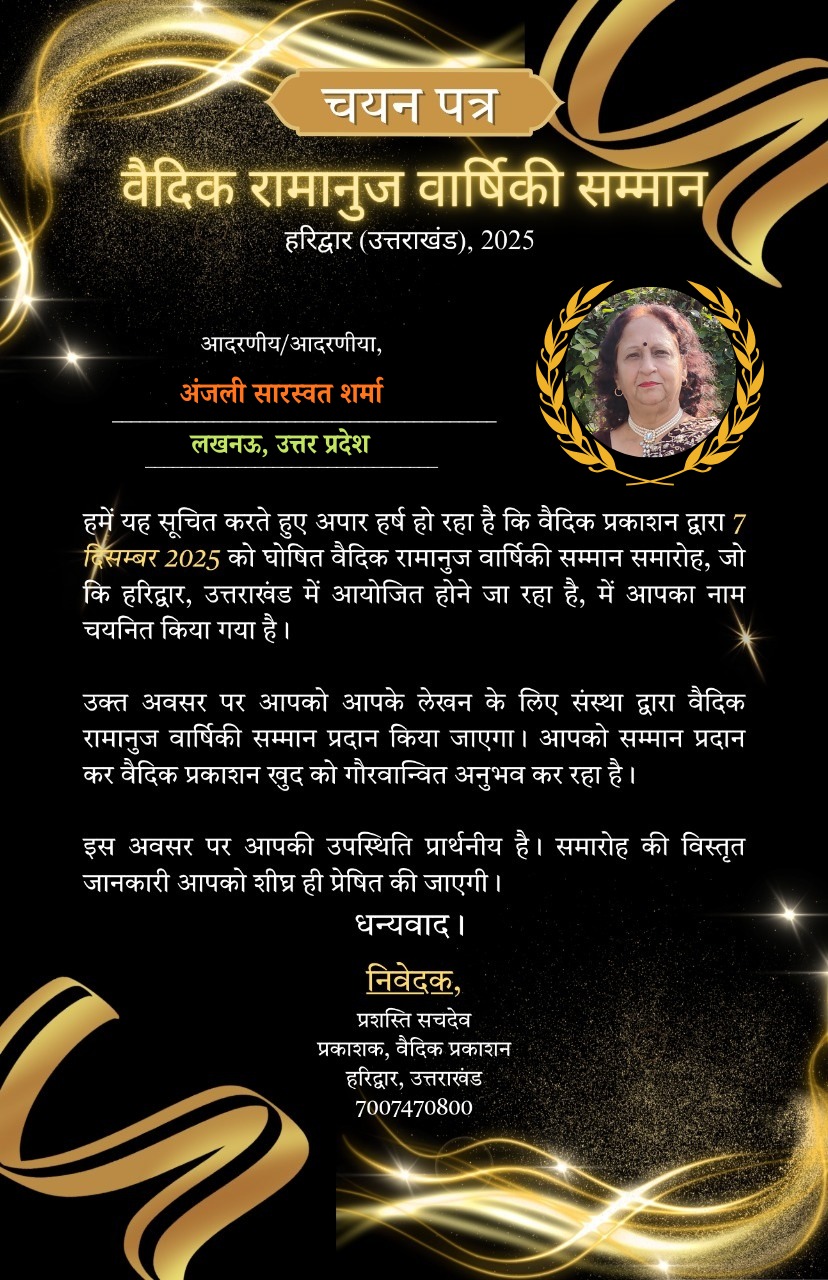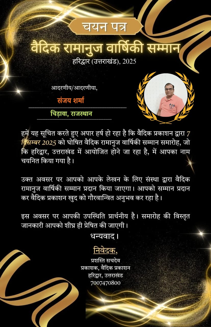 वैदिक रामानुज वार्षिकी सम्मान चयन पत्र