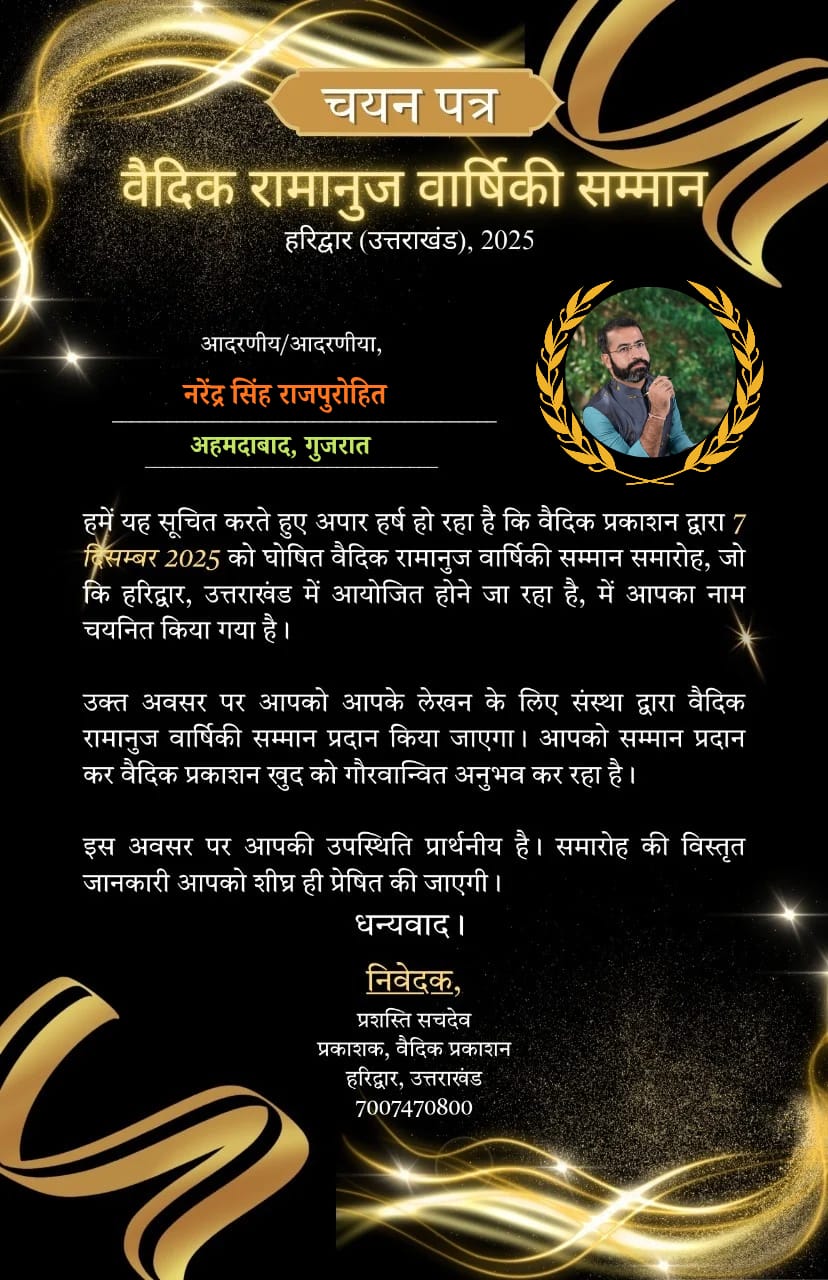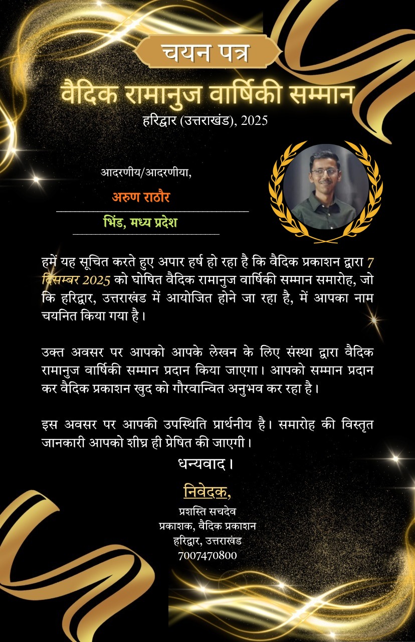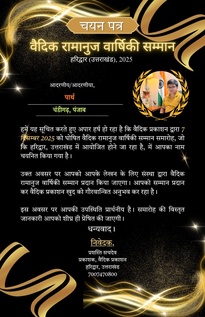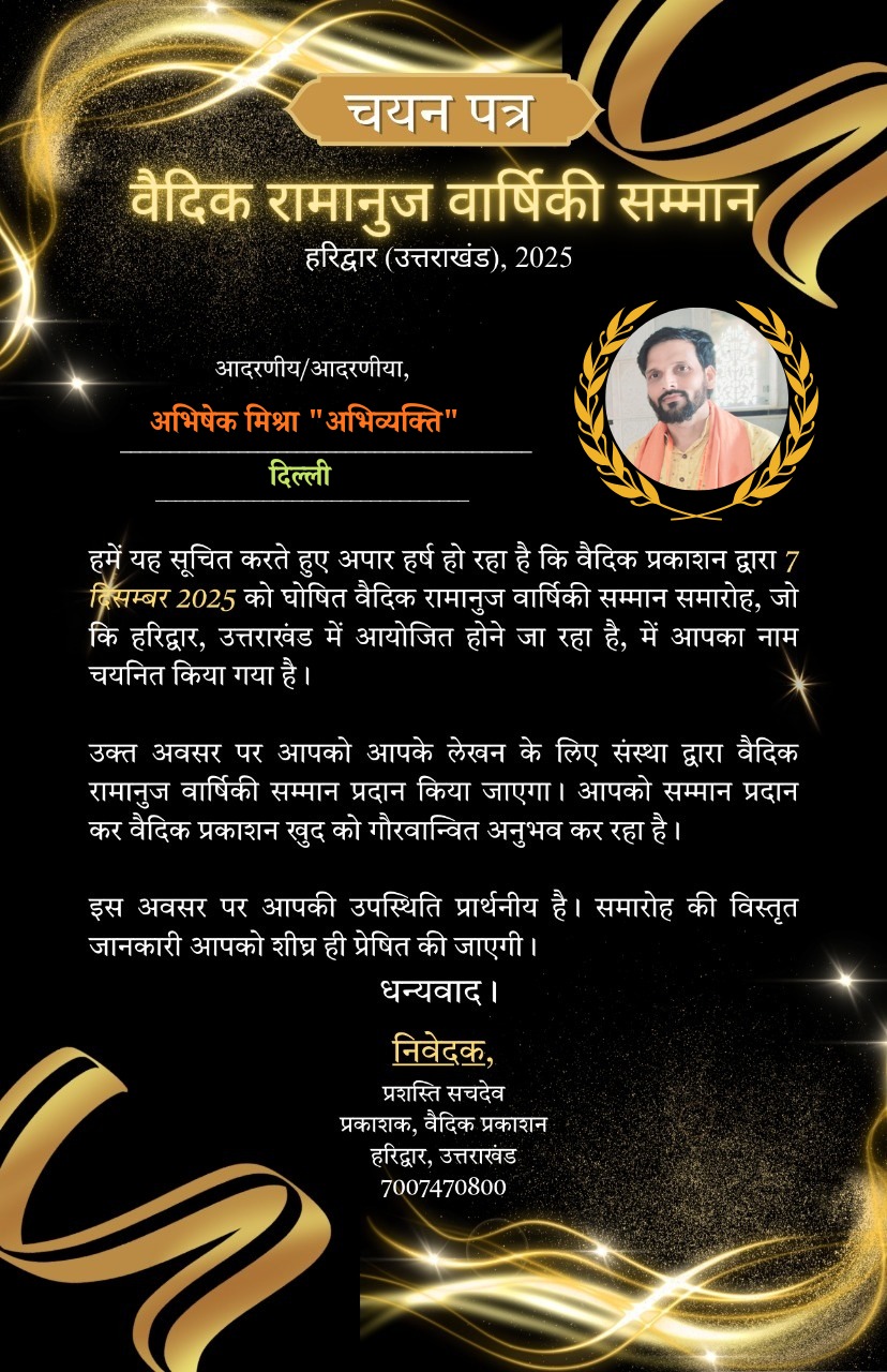 वैदिक रामानुज वार्षिकी सम्मान चयन पत्र