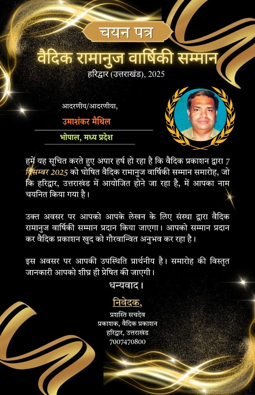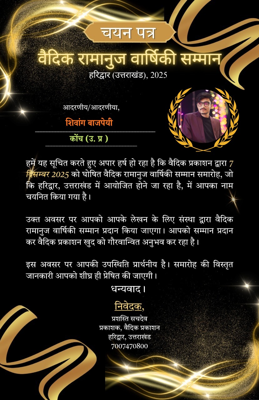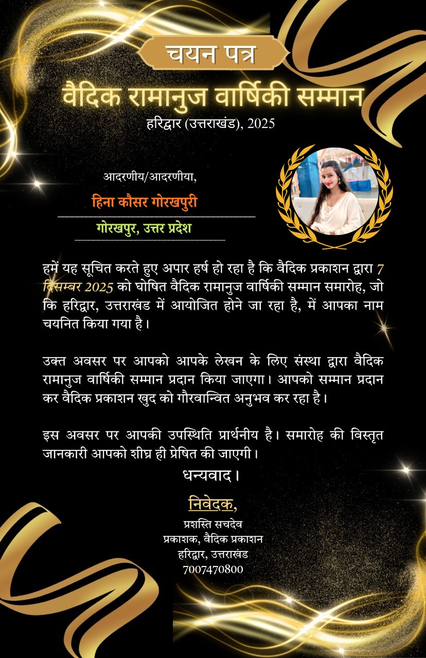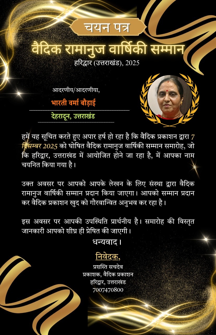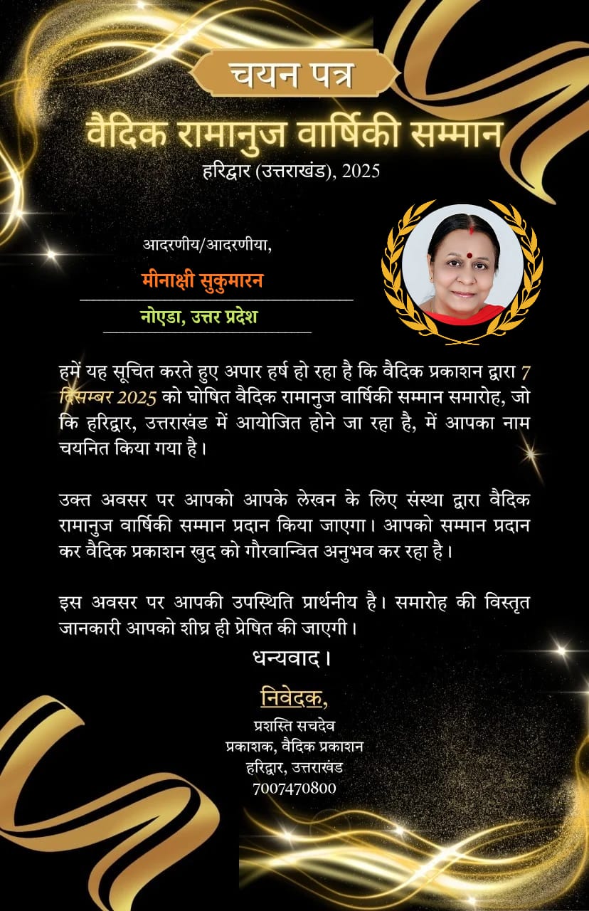 वैदिक रामानुज वार्षिकी सम्मान चयन पत्र