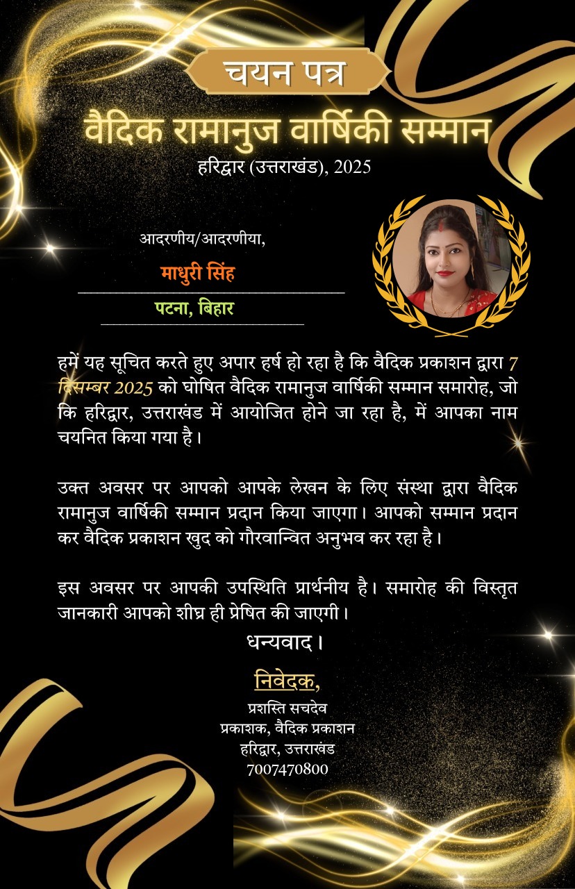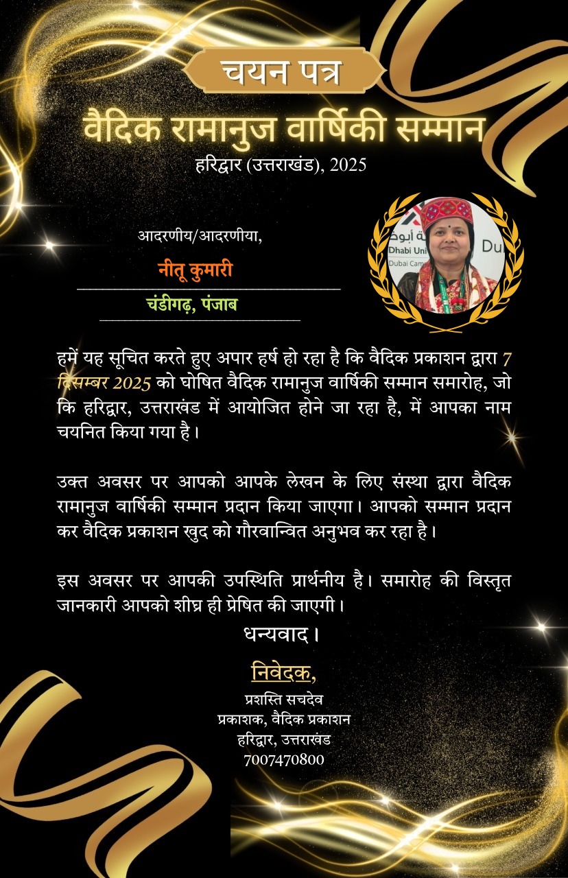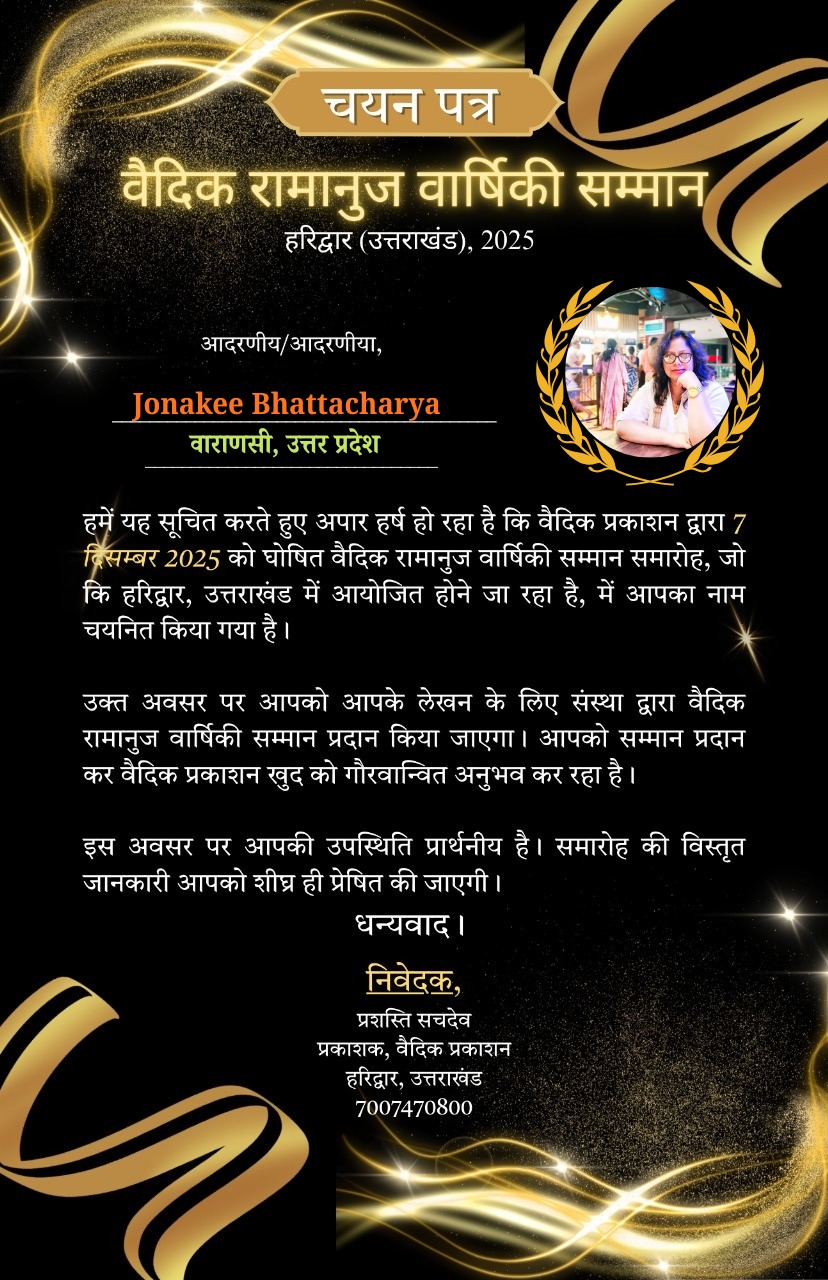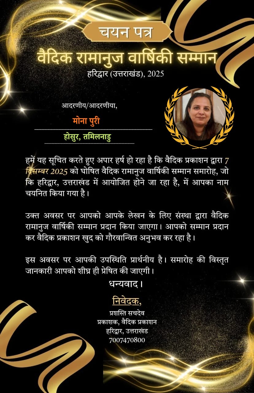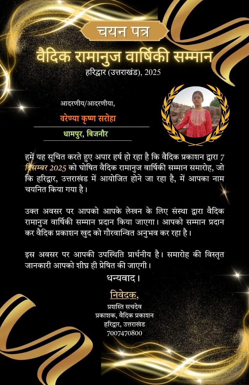 वैदिक रामानुज वार्षिकी सम्मान चयन पत्र